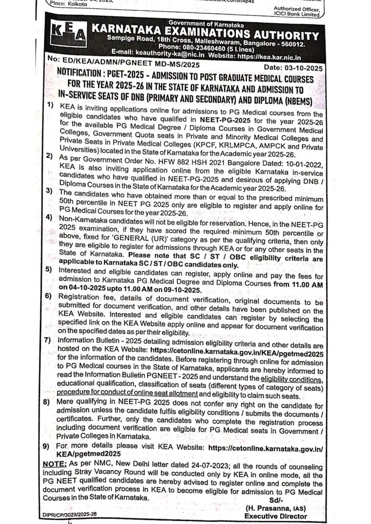 Karnataka Examinations Authority (KEA), Bangalore, has made a big announcement (PGET-2025) seeking online admission to Post Graduate (PG) Medical courses in the academic year 2025-26 in the State of Karnataka. These cover both applications to PG Medical Degree/Diploma Courses and dnbs (primary and secondary) and diploma (NBEMS) seats.