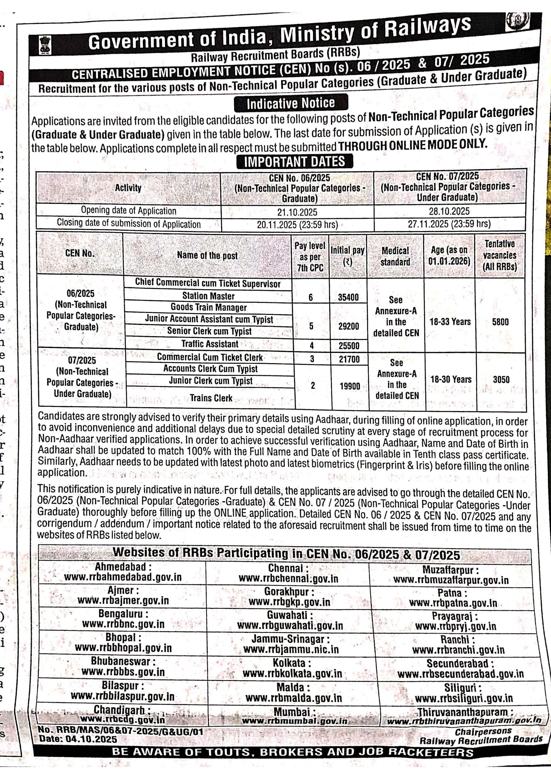 This current notification serves a purely indicative purpose. Participating RRBs, such as Ahmedabad, Ajmer, Bengaluru, Bhopal, Chennai, Kolkata, Mumbai, etc. will post the full detailed CEN No. 06/2025 and CEN No. 07/2025, with relevant addendums and notices. Candidates are advised to read the complete CEN carefully before applying.
