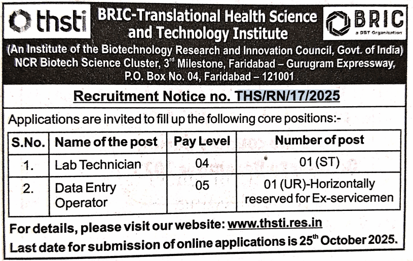 Do you have a passion to work in cutting-edge health research as a translational research professional? BRIC-Translational Health Science and Technology Institute (THSTI), a renowned organization of Biotechnology Research and Innovation Council (BRIC), Govt. of India, is inviting highly motivated people on core jobs as Lab Technician and Data Entry Operator.